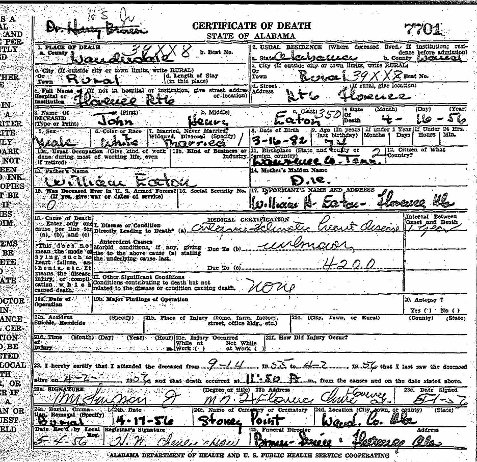 - “Alabama Deaths, 1908-1974,” entry for John Henry Eaton, no. 7701, 1956, Lauderdale County, Alabama; digital images, FamilySearch (https://familysearch.org : accessed 30 June 2023).